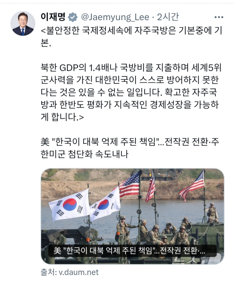 이 대통령은 이날 엑스(X·옛 트위터)에 "불안정한 국제정세 속에 자주국방은 기본 중의 기본이다"라며 이같이 적었습니다.