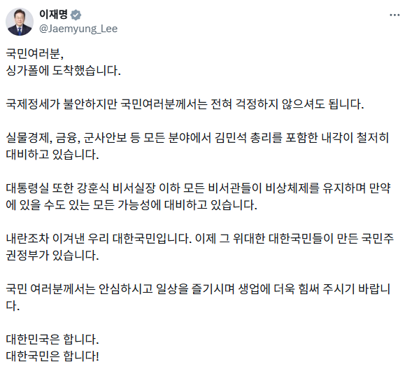 이 대통령은 이날 싱가포르 창이 국제공항에 도착한 뒤 엑스(X·옛 트위터)에 글을 올려 이같이 언급했습니다.