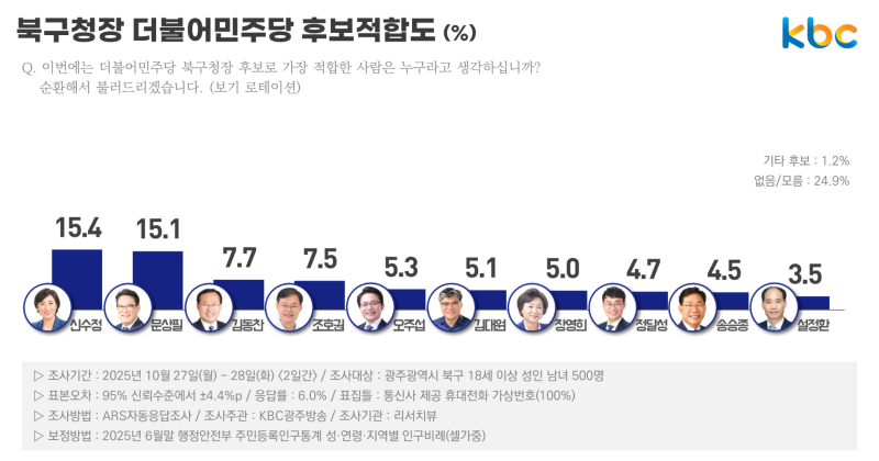 KBC 광주방송이 여론조사 전문기관 리서치뷰에 의뢰해 지난 27~28일 광주광역시 북구 거주 만 18세 이상 유권자 500명을 대상으로 2026년 지방선거 후보 지지도를 조사한 결과, 문상필 부대변인 16.3%, 신수정 의장이 12.8%로 오차범위(±4.4%p) 내에서 치열한 선두 다툼을 나타냈습니다.