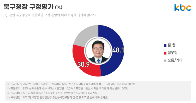 문인 북구청장의 전반적인 구정 운영에 대한 조사에서는 잘함 48.1%(매우 잘함 16.8%, 잘함 31.4%), 잘못함 30.9%(잘못함 18.9%, 매우 잘못함 11.9%)로 집계됐습니다.