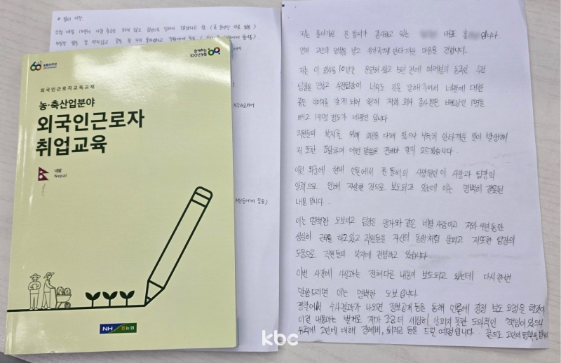 ▲(왼쪽) 뚤시와 네팔 노동자들이 입국 직후 사흘간 농협에서 취업교육을 받을 때 받은 자료. 고충 처리 방법에 대해서는 들은 바가 없다고 말함. (오른쪽) 돼지농장주 홍모씨가 KBC 취재진에게 전한 입장문.