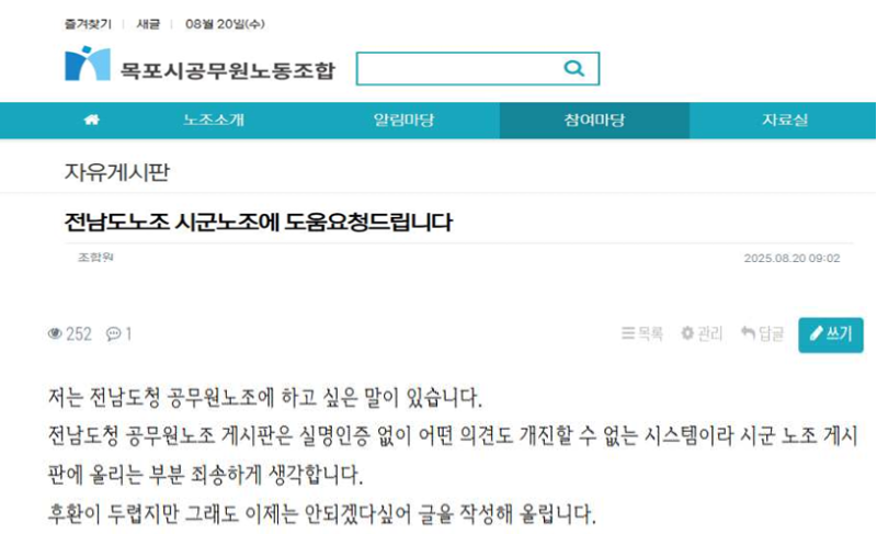 글을 쓴 이는 "전남도청 공무원노조 게시판은 실명 인증이라 익명으로 운영되는 시·군 게시판에 글을 올렸다"고 밝혔습니다.