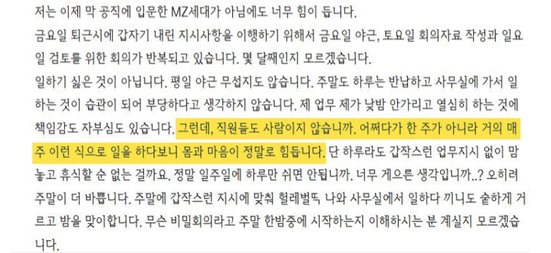 이어 "일하기 싫은 것이 아니다. 평일 야근도 무섭지 않다. 주말도 하루는 반납하고 사무실에 가서 일하는 것이 습관이 되어 부당하다고 생각하지 않는다. 제 업무 제가 낮밤 안 가리고 열심히 하는 것에 책임감도 자부심도 있다. 그런데 직원들도 사람이지 않습니까"라고 적었습니다.
