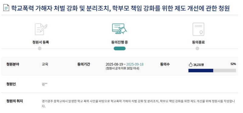 작성자는 지난 3월부터 가해 학생이 자신의 부모가 학교 운영위원이라 자신에게 함부로 할 수 없다고 말하고 다녔다며, 가해자 부모의 자격 여부를 재심사하고 부모 책임을 강화해야 한다고 주장했습니다.