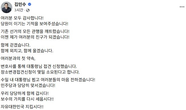 그는 "장소 변경 접견 신청에 며칠이 소요된다고 한다"며 "당원이 이기는 기적을 보여주신 것에 감사드린다"고 소감을 남겼습니다.