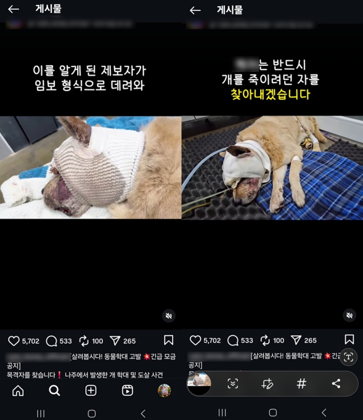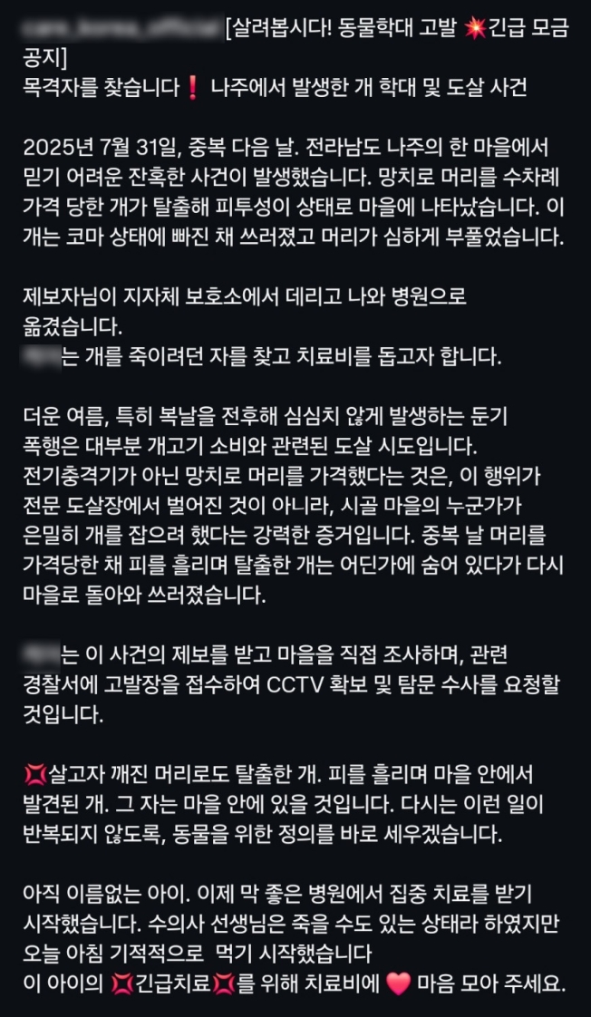 고소장에 따르면, 해당 단체는 지난달 말 나주의 한 도로에서 머리를 크게 다친 채 발견된 개를 두고 "망치로 머리를 수차례 가격당한 개"라고 묘사했습니다.
