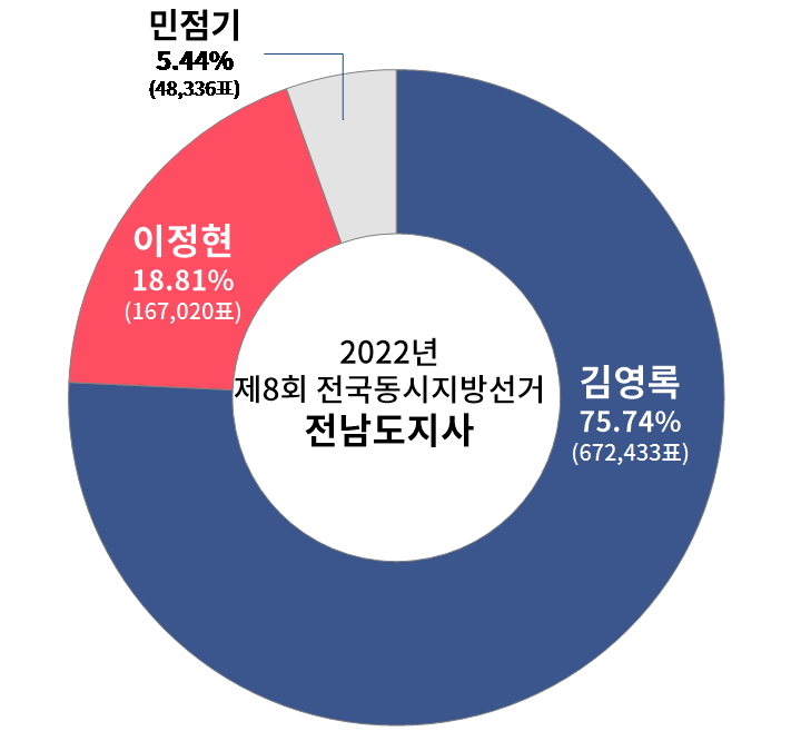 2022년 제8회 전국동시지방선거 전라남도지사 선거에서 더불어민주당 김영록 후보가 67만 2,433표(득표율 75.74%)를 얻어 당선됐습니다.