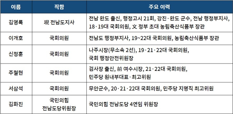 현재까지 △김영록 현 전남도지사 △이개호 국회의원 △신정훈 국회의원 △주철현 국회의원 △서삼석 국회의원 △김화진 국민의힘 전남도당위원장 등이 주요 출마 예정자로 거론되고 있습니다.