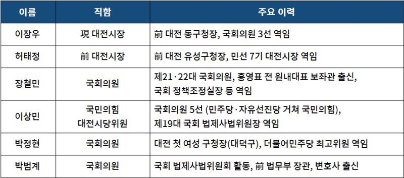 여러 지역 언론에 따르면 ▲이장우 현 대전시장 ▲허태정 전 대전시장 ▲장철민 국회의원 ▲이상민 국민의힘 대전시당위원장 ▲박정현 국회의원 ▲박범계 국회의원 ▲김제선 대전 중구청장 등이 출마 예정자로 주목받고 있습니다.