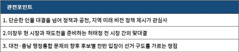 이번 대전시장 선거는 단순한 인물 대결을 넘어 정책과 공천, 지역 미래 비전이 교차하는 다층 구도가 될 것으로 전망됩니다.