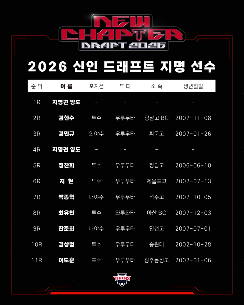 프로야구 KIA 타이거즈가 2026 신인드래프트 지명을 마쳤습니다.