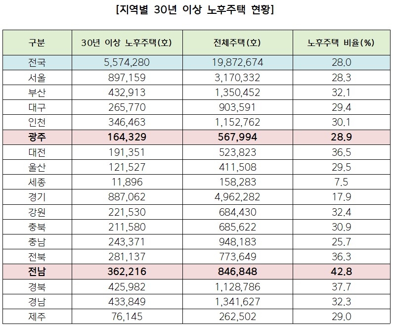 또 전국에서 가장 열악한 전남지역은 전체 주택 84만6,848호 가운데 노후주택이 36만2,216호에 달했고, 노후주택 비율은 전국에서 가장 높은 42.8%로 나타났습니다.