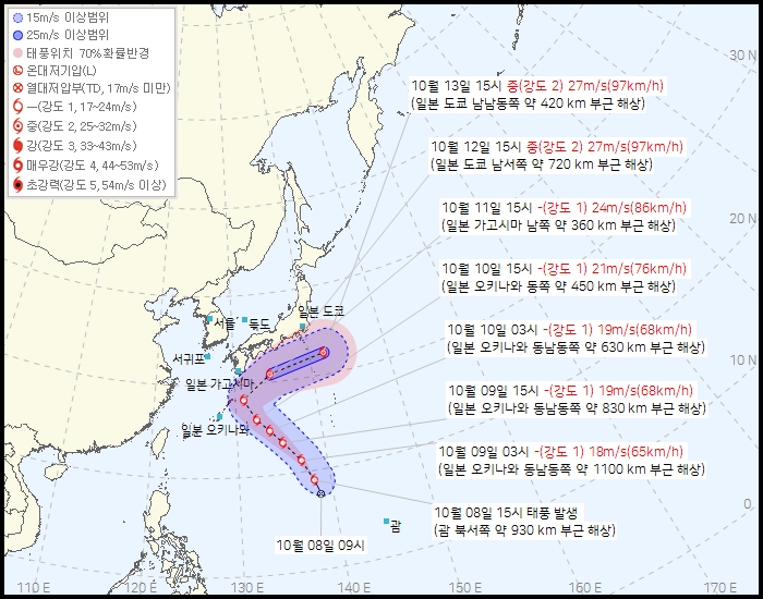 시속 21km 속도로 북북서진 해 9일 일본 오키나와 동남동쪽까지 접근하겠고, 11일 오후 가고시마 남쪽 부근 해상을 지나며 방향을 급격히 틀 것으로 전망됩니다.