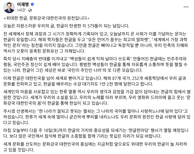 이 대통령은 9일 자신의 SNS에 "한글은 우리 민족의 지혜와 역사가 응축된 문화유산이며, 백성이 쉽게 익혀 쓰도록 만들어진 글자에는 민주주의와 평등, 국민주권 정신이 깊게 배어 있다"고 적었습니다.