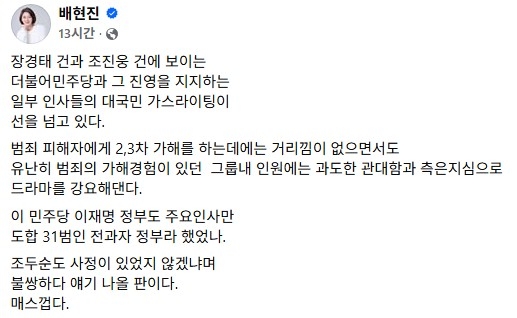 배현진 의원은 8일 자신의 페이스북에 "장경태 건과 조진웅 건에 보이는 더불어민주당과 그 진영을 지지하는 일부 인사들의 대국민 가스라이팅이 선을 넘고 있다"고 말했습니다.