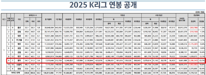 한국프로축구연맹이 공개한 2025시즌 구단별 연봉 지출 현황에서 광주FC의 연봉 총액이 전년 대비 23.7% 감소한 것으로 나타났습니다.