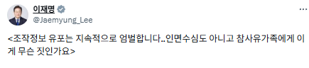이재명 대통령은 4일 10·29 이태원 참사와 관련한 반복적인 2차 가해를 한 60대 남성이 구속됐다는 소식을 알리며 "조작정보 유포는 지속적으로 엄벌한다"고 경고했습니다.