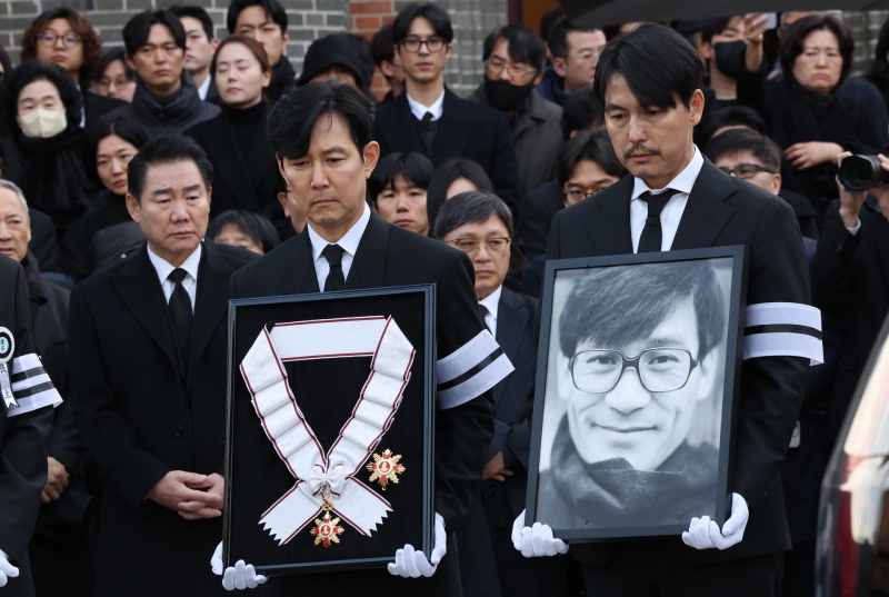 고인의 소속사 아티스트컴퍼니 배우인 정우성과 이정재가 영정과 금관문화훈장을 들고, 설경구·박철민·유지태·박해일·조우진·주지훈이 운구를 맡았습니다.