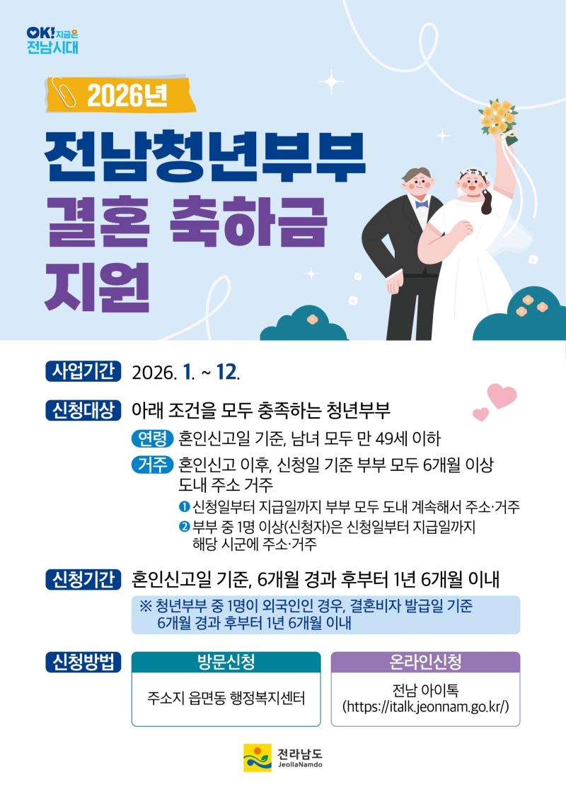 결혼축하금은 주소지 관할 읍면동 행정복지센터를 방문해 신청하거나 전남 아이톡에서 온라인으로 접수하면 됩니다.