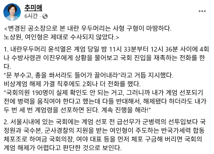그러면서 "12월 3일 부대를 출동시킨 두 사령관보다도 윤석열과 함께 내란을 설계하고 체포조를 편성해 민주주의를 매장시키려 한 노상원과 여인형에 대한 수사가 지나치게 표피적"이라고 지적했습니다.