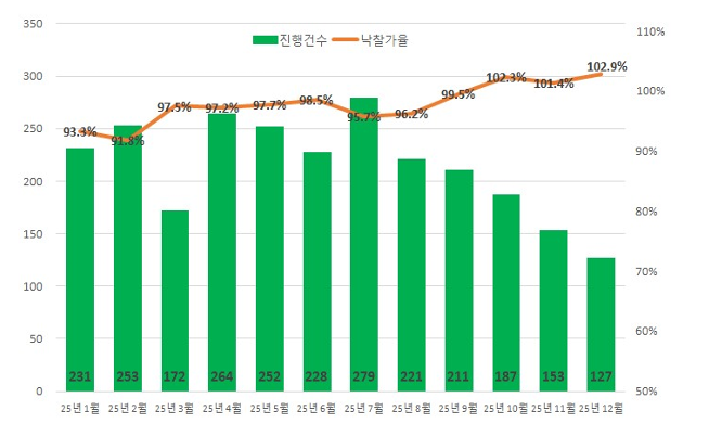 경·공매 데이터 전문기업 지지옥션이 발표한 '2025년 12월 경매동향보고서'에 의하면 서울 아파트 진행 건수는 127건, 낙찰률은 42.5%로 전달(50.3%)보다 7.8%p 하락했습니다.