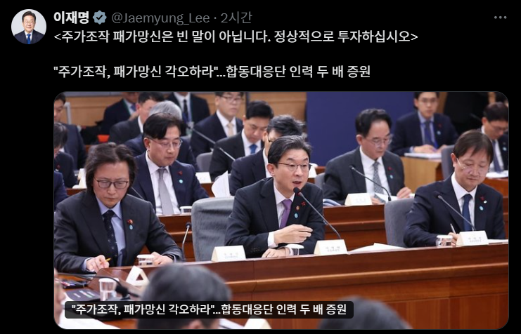 이 대통령은 주가조작 등 시장교란 행위에 대한 엄정한 처벌이 한국 주식 시장의 저평가를 걷어내는 길이기도 하다며 "한국 시장에서 주가 조작이나 부정 거래를 하면 패가망신한다는 것을 확실하게 보여줘야 한다"라고 여러 차례 강조해 왔습니다.