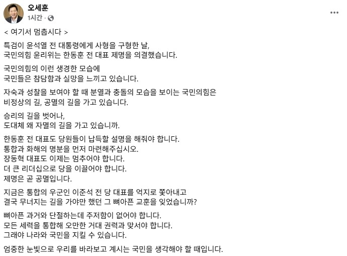 오 시장은 15일 페이스북에 "특검이 윤석열 전 대통령에게 사형을 구형한 날, 국민의힘 윤리위는 한동훈 전 대표 제명을 의결했다"며 "국민의힘의 이런 생경한 모습에 국민들은 참담함과 실망을 느끼고 있다"고 적었습니다.