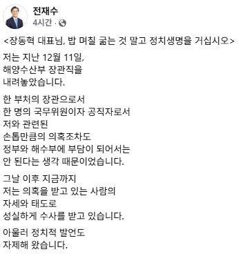 전 의원은 이날 페이스북에 "장 대표가 단식의 명분으로 전재수를 특정했다"며 이같이 적었습니다.