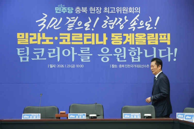 ▲더불어민주당 정청래 대표가 23일 충북 진천 국가대표선수촌에서 열린 현장 최고위원회의에 참석하고 있다 [연합뉴스]