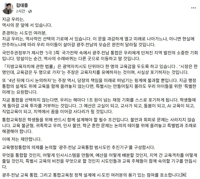 김대중 교육감은 25일 자신의 SNS 계정을 통해 "행정통합의 설계도 위에 교육을 함께 올려놓지 않는다면, 특별시는 만들어질지 몰라도 우리 아이들을 위한 특별한 미래는 요원하다"며 이같이 적었습니다.