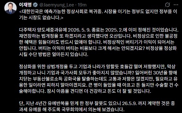 이재명 대통령은 25일 자신의 SNS를 통해 "다주택자 양도세 중과 유예의 2026년 5월 9일 종료는 이미 정해진 것"이라고 다시한번 강조했습니다.