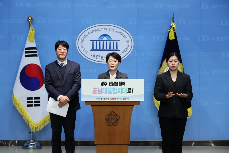 진보당 전종덕 의원은 28일 국회에서 기자회견을 열고, 현재 추진 중인 광주·전남 행정통합을 넘어 전북을 포함한 '500만 호남대통합'으로 나아가야 한다고 주장했습니다.