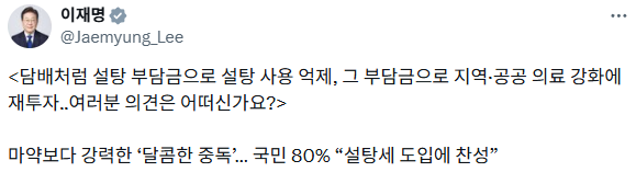 이 대통령은 28일 엑스(X·옛 트위터)에 국민의 80%가 설탕세 도입에 찬성한다는 내용의 기사를 올리며 "담배처럼 설탕 부담금으로 설탕 사용 억제, 그 부담금으로 지역·공공의료 강화에 재투자"라고 적었습니다. 그러면서 "여러분 의견은 어떠신가요"라고 물었습니다.