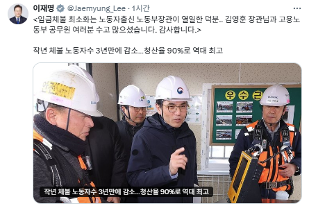 이 대통령은 30일 엑스(X·옛 트위터)에 '작년 체불 노동자 수 3년 만에 감소…청산율 90%로 역대 최고'라는 제목의 기사를 소개하면서, "김영훈 장관님과 고용노동부 공무원 여러분 수고 많으셨다. 감사하다"고 적었습니다.