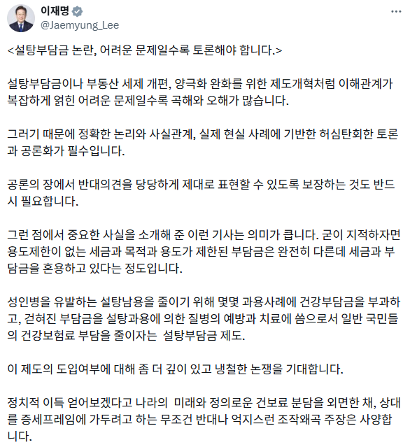 이재명 대통령은 설탕 부담금 도입 논란과 관련해 "이해관계가 복잡한 문제일수록 정확한 사실과 논리에 기반한 토론과 공론화가 필요하다"고 강조했습니다.