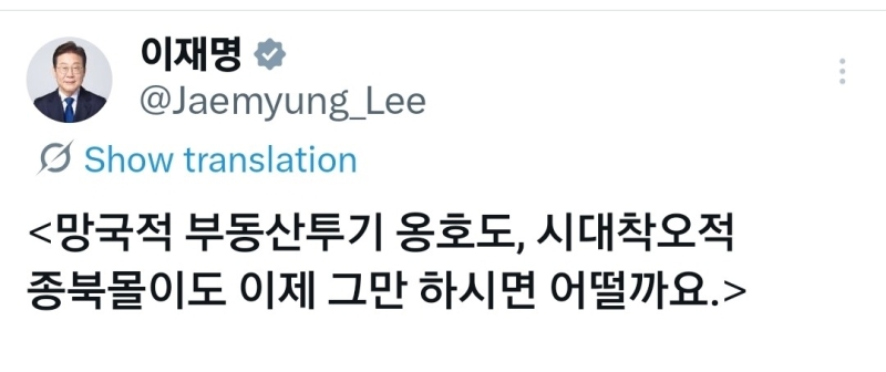 이 대통령은 이날 엑스(X·옛 트위터)에 글을 올려 정부의 공급대책을 비판한 국민의힘 최보윤 수석대변인의 논평이 담긴 기사를 링크하며 이같이 밝혔습니다.