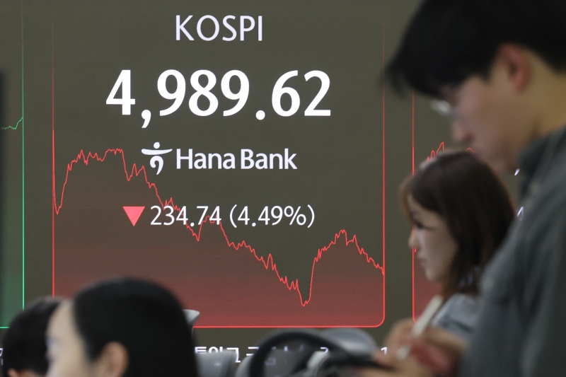코스피가 미국 증시 약세 여파로 인해 5,000선 아래로 내려갔습니다.