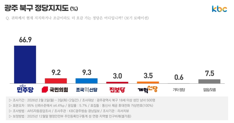 광주 북구 정당지지도는 △더불어민주당(66.9%) △조국혁신당(9.3%) △국민의힘(9.2%) △개혁신당(3.5%) △진보당(3.0%) 순입니다.