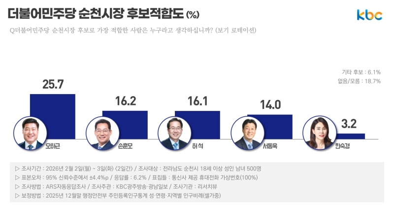 KBC광주방송이 여론조사 기관 리서치뷰에 의뢰해 지난 2~3일 순천시 거주 만 18세 이상 500명을 대상으로 조사한 결과, 다자 대결 지지도는 노관규 순천시장 26.5%, 오하근 전 순천시장 후보 22.5%로 오차범위(±4.4%p) 내로 집계됐습니다.