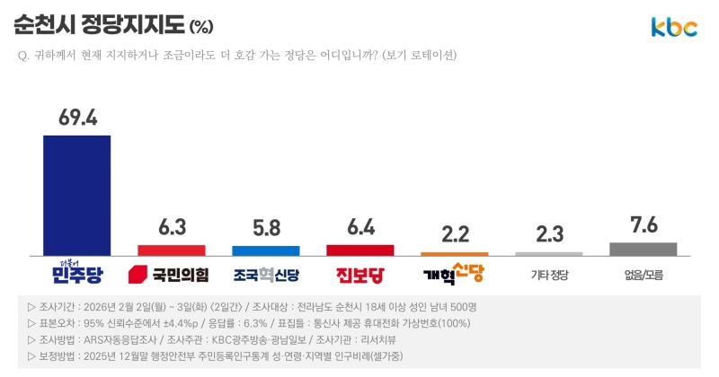 정당지지도 민주당 69.4% 우세 속 진보당 6.4%, 국민의힘 6.3%