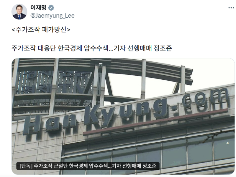 이재명 대통령이 6일 한 경제지의 일부 기자들이 이른바 '선행매매'를 통해 부당 이득을 취한 혐의로 당국의 수사를 받는 것과 관련해 "주가조작 패가망신"이라고 말했습니다.