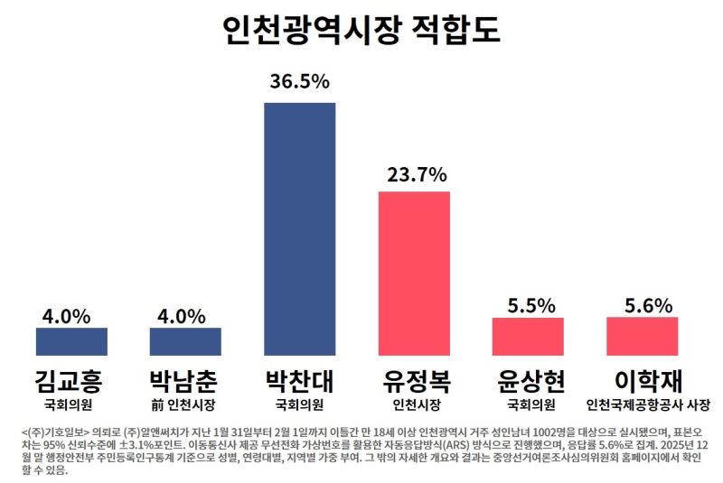 (주)기호일보 의뢰로 (주)알앤써치가 지난 1월 31일~2월 1일 실시한 여론조사에 따르면 인천시장 적합도에서 박찬대 의원이 36.5%, 유정복 현 인천시장(국민의힘)은 23.7%를 기록했습니다.