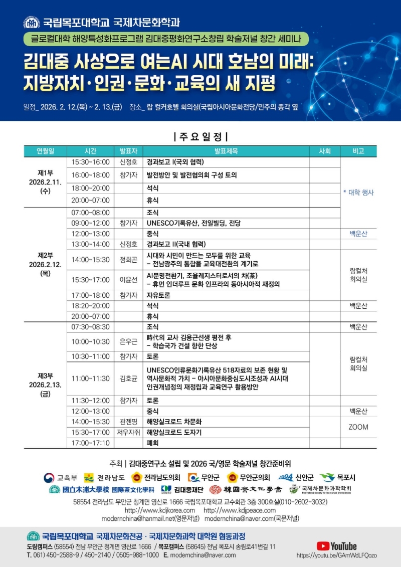 국립목포대학교 국제차(茶)문화학과가 '글로컬대학 해양특성화프로그램 김대중평화연구소 창립 학술저널 창간 세미나'를 개최합니다.