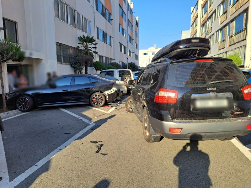 ▲아파트 주차장서 차량 7대 연쇄 출돌 (부산영도경찰서 제공) 재판매 DB금지 [연합뉴스]