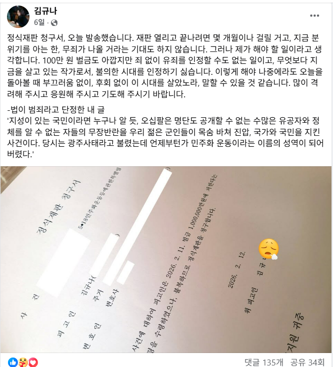 김규나 작가는 최근 자신의 소셜미디어에 "100만 원 벌금도 아깝지만 죄 없이 유죄를 인정할 수도 없는 일이고 무엇보다 지금을 살고 있는 작가로서 불의한 시대를 인정하기 싫다"며 이같이 밝혔습니다.