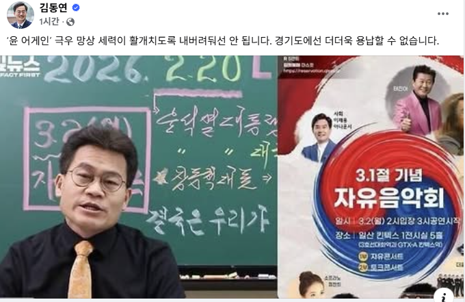 김 지사는 페이스북에 "'윤 어게인' 극우 망상 세력이 활개 치도록 내버려둬선 안 된다. 경기도에선 더더욱 용납할 수 없다"며 대관 취소 필요성을 강조했습니다.