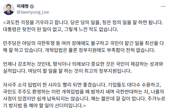 특히 이날 본회의 상정을 앞둔 '자사주 소각 의무화'(3차 상법 개정안)를 언급하며, 이를 반대하는 국민의힘을 향해 "왜 밤까지 새우며 극한 반대하는지 납득되지 않는다"고 비판하며 여당에 힘을 실어주었습니다.