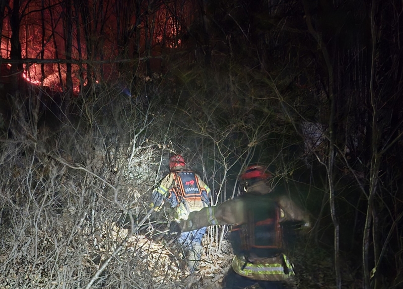 ▲ 25일 오후 경북 영주시 안정면 용산리 야산에 공군 전투기가 추락하면서 발생한 산불 현장에서 소방당국이 진화하고 있다 [연합뉴스]
