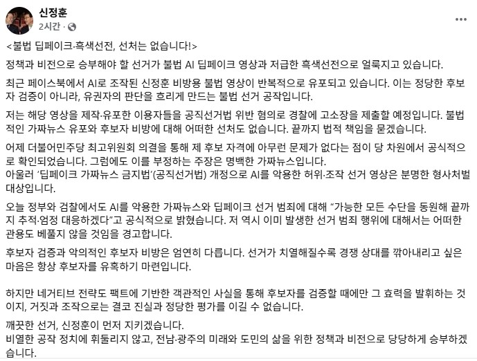 신 의원은 26일 자신의 SNS에 '불법 딥페이크·흑색선전, 선처는 없습니다'라는 제목과 함께 "최근 페이스북에서 AI로 조작된 신정훈 비방용 불법 영상이 반복적으로 유포되고 있다"며 "이는 정당한 후보자 검증이 아니라, 유권자의 판단을 흐리게 만드는 선거 공작"이라고 적었습니다.
