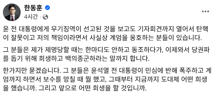 한 전 대표는 이날 페이스북에 글을 올려 "윤 전 대통령에게 무기징역이 선고된 것을 보고도 기자회견까지 열어서 탄핵이 잘못이고 저의 책임이라면서 사실상 계엄을 옹호하는 분들이 있다"고 밝혔습니다.